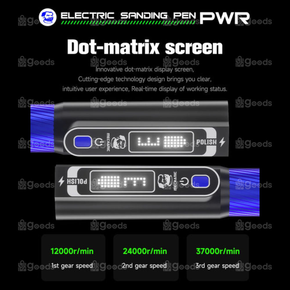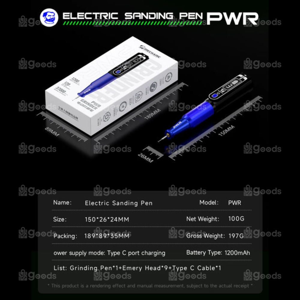 Mechanic PWR electric sanding pen with different grinding and polishing heads for mobile phone motherboard cutting, CPU BGA chip grinding, bracket removal, screw removal, frame correction, etc. High torque motor, built-in 1200mAh battery, meet various cutting, grinding and polishing needs of mobile phone electronic product repair.